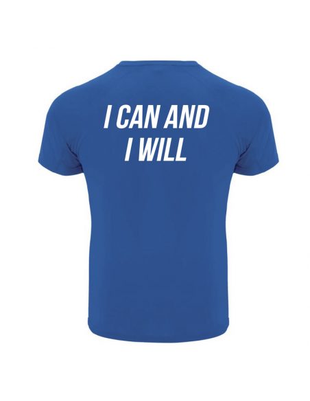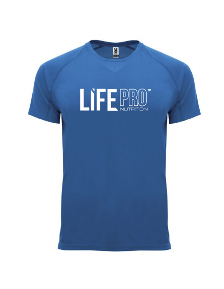 The T-shirt is vibrant blue and features a silver screen-printed brand logo on the front.