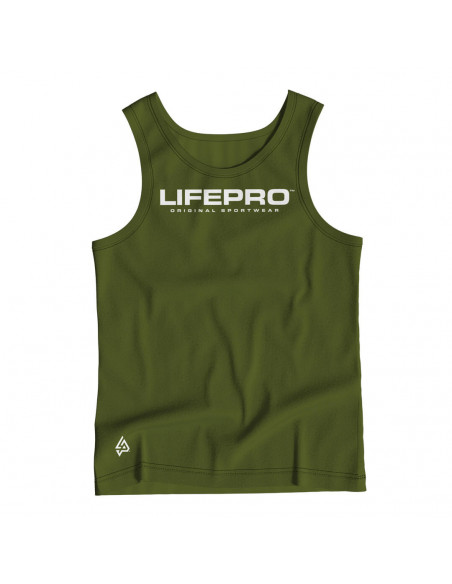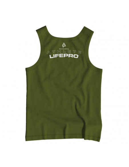 Tank top técnico en color verde militar con corte atlético y cómodo. Su tejido ligero y transpirable lo convierte en una prenda ideal para cualquier tipo de entrenamiento, especialmente en días calurosos. Con el logo de Life Pro como protagonista, refleja un estilo funcional y seguro.