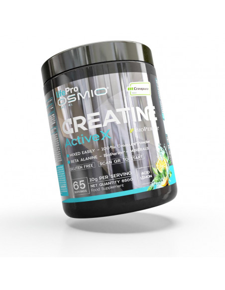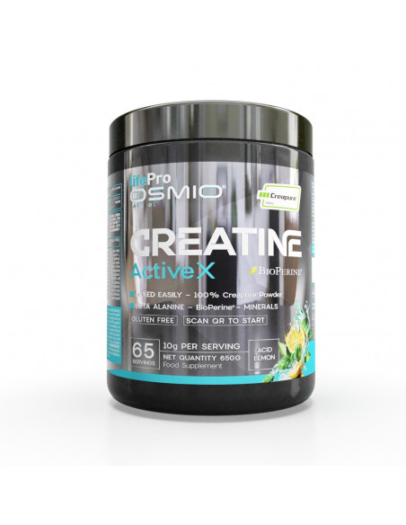 Life Pro Osmio Creatine Active se presenta en un envase de 650 g, equivalente a 65 servicios, lo que permite una planificación cómoda de la suplementación a medio plazo. La dosis diaria recomendada es de 10 g, disueltos en agua, preferentemente antes del entrenamiento en días de actividad física.