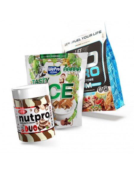 - Life Pro Fit Food Protein Cream NutPro Duo 250g, una crema proteica de avellanas y cacao, sin gluten y baja en azúcar, perfecta para complementar una dieta equilibrada.